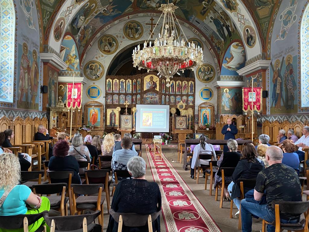Ultima oprire a acestui pelerinaj virtual a fost la biserica Parohiei. Aici, lângă o părticică din moaștele Sfântului Alexie, pr. Marius N. Lauruc a susținut o mică prezentare a vieții și activității celor mai cunoscuți sfinți ucraineni de pe teritoriul României: Sfântul Vasile de la Poiana Mărului (care a pus un accent deosebit pe redescoperirea și asimilarea scrierilor isihaste), Sfântul Paisie Velicikovschi (ales, cu binecuvântarea P.F. Patriarh Daniel ocrotitor la Vicariatului Ortodox Ucrainean din România), a cărui activitate a influențat spiritualitatea tuturor popoarelor ortodoxe și Sf. Alexie Carpatinul.
