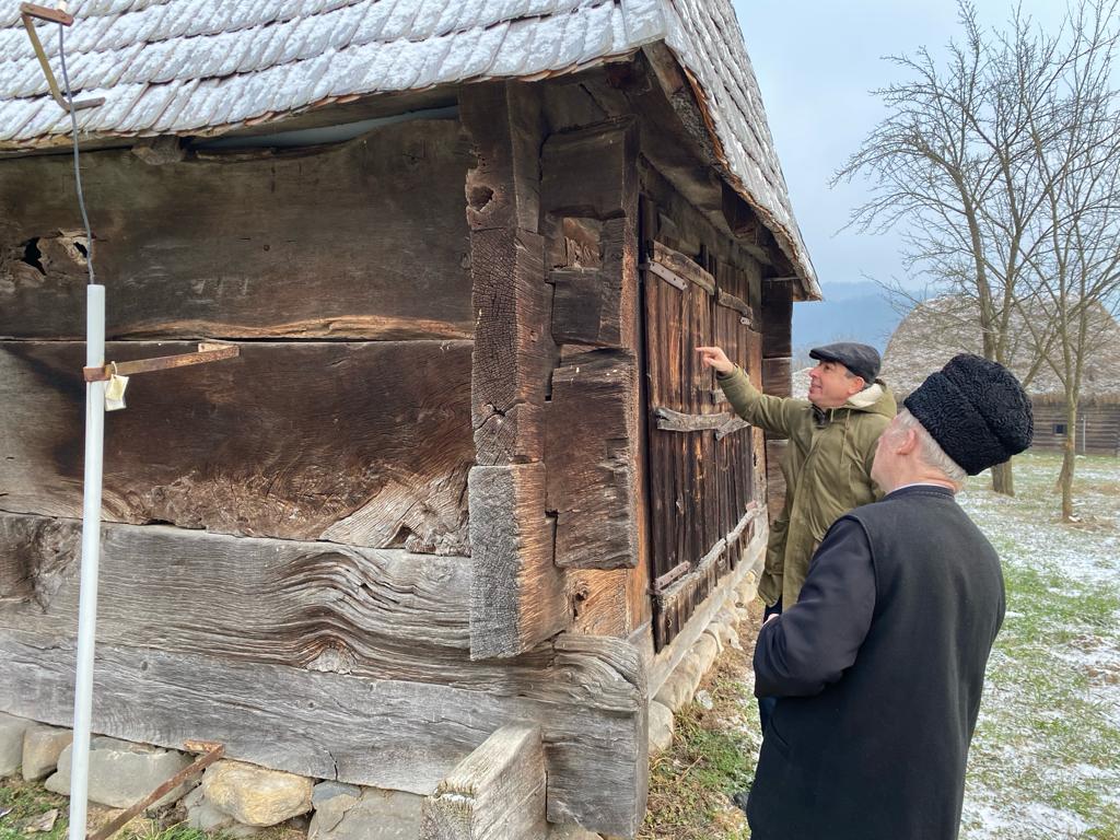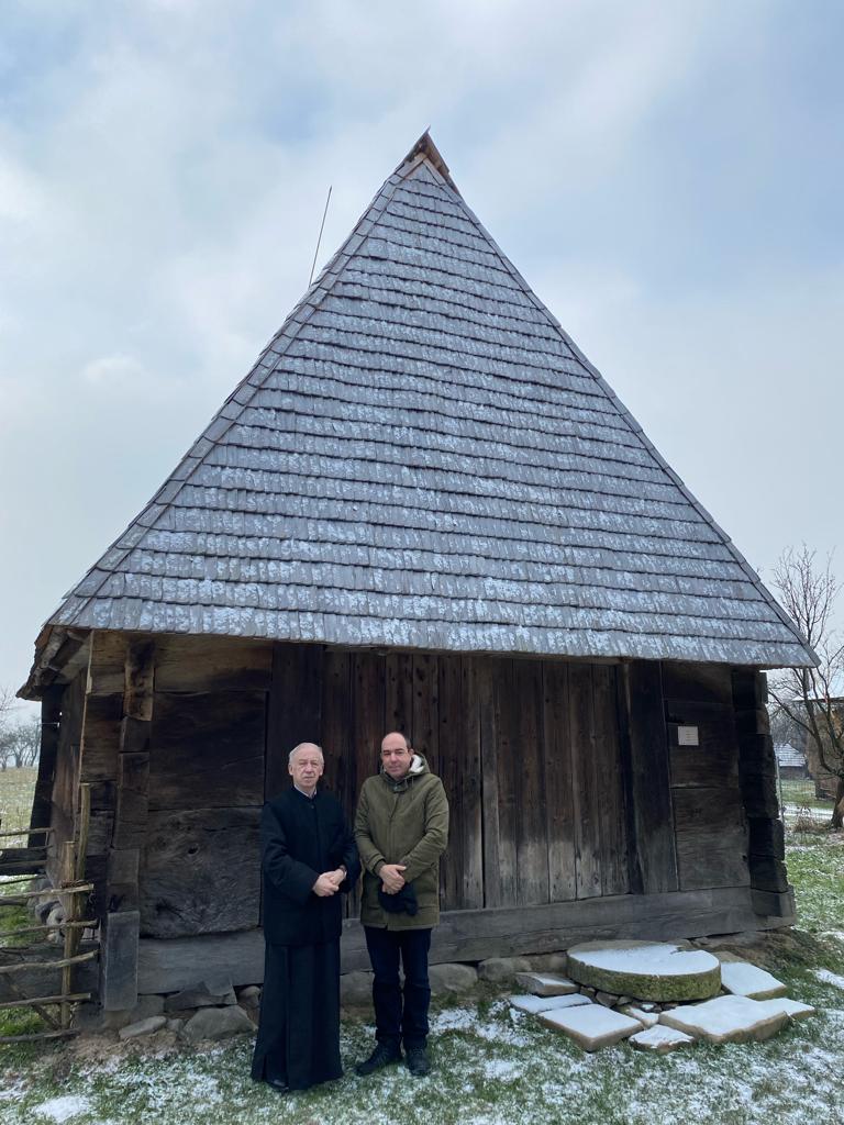 Pr. Vicar Nicolae Lauruc și Dl Teofil Ivanciuc lângă șura din Muzeul Satului