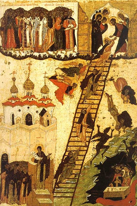 ,,Icoanele îl înfățișează ținând Scara care duce la cer, cu îngeri ajutând sufletele să urce și demoni încercând să le împiedice”[5].