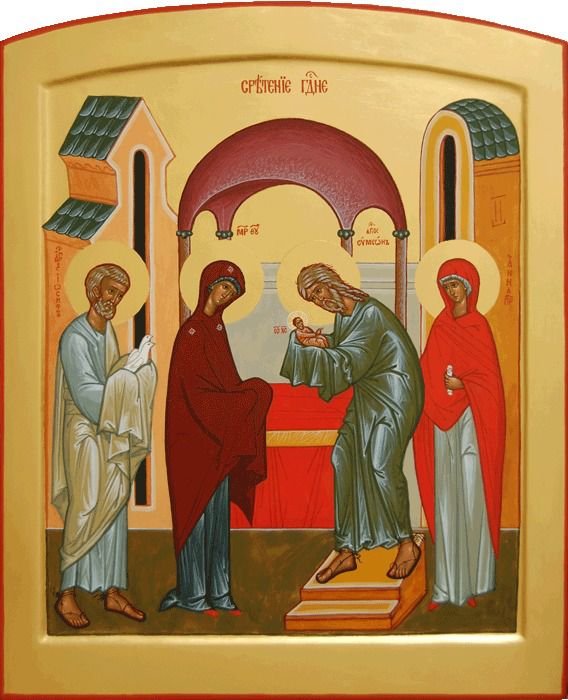 На 40-й день від народження Ісуса Христа, Діва Марія разом з Іосифом пішла до храму, щоб принести жертву очищення. За законом давніх юдеїв, багата жінка мала принести ягня та молодого голуба, вбога — пару голубів чи горлиць. Пречиста принесла пару горлиць. У храмі вона зустріла праведного Симеона, якому провидінням була передбачена зустріч із Месією. Взявши дитя на руки, праведник благословив його, а Богородиці сповістив про її майбутню жертву.